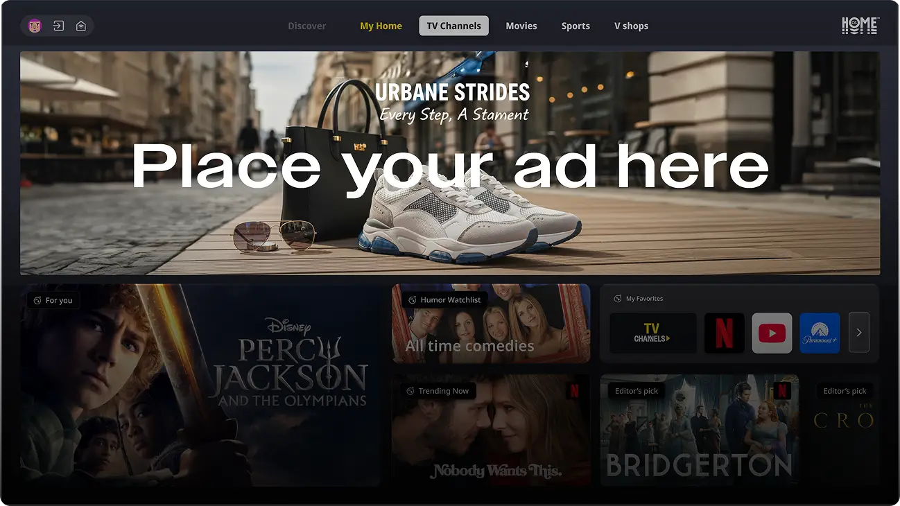 V supports a range of advertising formats across the HomeOS (Formerly VIDAA OS) ecosystem, including native ad formats integrated into the operating system and premium CTV video ads across curated, brand safe inventory on V channels.